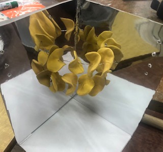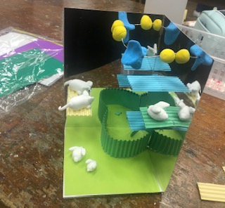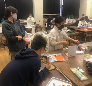 写真は、5年図画工作「鏡の世界」の学習のようすです。鏡の写り込みと空間を生かして材料を工夫して用い、楽しく自分の表したい世界を表現することをめあてに取り組んでいます。