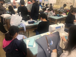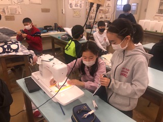 写真は、6年家庭科「共に生きる生活」の学習のようすです。下級生にプレゼントする雑巾作りや、家族に感謝の気持ちを表すクッション作りに取り組んでいる場面です。