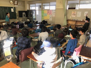左の写真は、鉄道クラブの活動のようすです。最終回となる今日は「めざせトワイライト賞」と題してクイズ大会を展開しています。