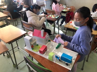 右の写真は、ペーパークラフトクラブの活動のようすです。クラブ終了時には体育館エントランスに作品を運び展示しました。明日から多くの人たちに見てもらいたいです。