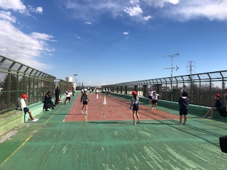左の写真は、スポーツ鬼ごっこクラブの活動のようすです。休憩をはさみながら屋上いっぱいに走り回っています。作戦も重要のようです。