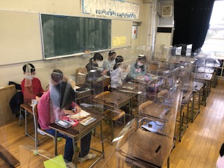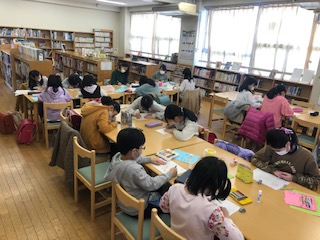 中央と右の写真は、創作漫画絵本クラブの活動のようすです。所属人数が多いので今日も図書室と低学年音楽室の2つの場所を使って活動しています。