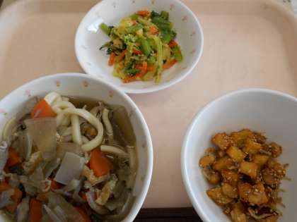 けんちんうどん 野菜のごまあえ 大豆といもの甘辛あげ 牛乳