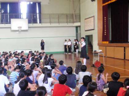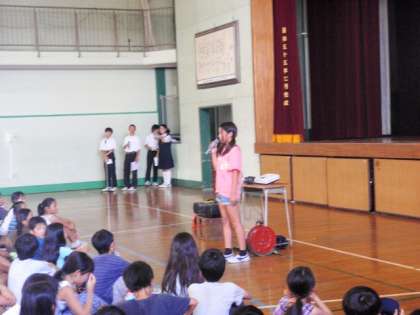 中学1年生がこの1学期の間で学んだ中学校の生活を紹介してくれました。全体で説明の後、校内を回り教室の様子を見学しました。最後に、体育館で1年生による合唱を聴き、最後一緒に歌いました。6年生はとても上手に歌ってました。