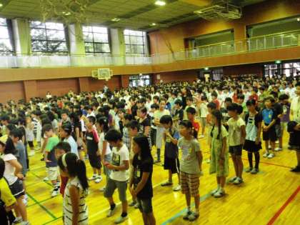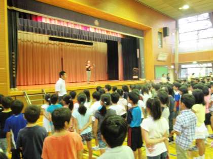 今日で一学期も終わりです。4月の始業式から始まりあっという間の4ヶ月でした。今学期は運動会が一番大きな行事でした。3年生の代表児童が作文を読み、この一学期を振り返りました。明日から長い休みになります。水泳指導・サマースクール・サマーワークショップやまちのお祭りなどいろいろな催し物があるので楽しみですね。9月1日に元気に元気な顔に会えるのを楽しみにしています。