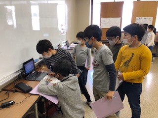 写真は、展示会場であるミーティングルームを見学している3年生のようすです。総合的な学習の時間のファイルを各自が持参していて、初めて知ったと驚いたことや気になること、興味や関心のある内容などを書き写したり、感想を書いたりしています。