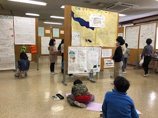 右の写真は、4年生「地域の環境をよくしよう」のコーナーです。野川・ゴミ拾いグループや、ノハカタカラクサ里山グループの掲示発表を読み込んだり記録したりしている場面です。