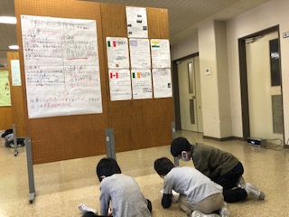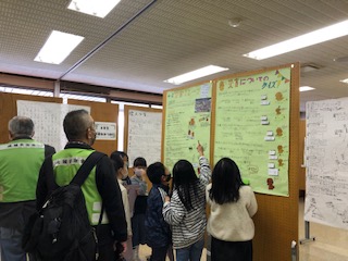 左は、4年生「地域の環境をよくしよう」のコーナーの中の「災害グループ」の発表を読み込んでいる場面です。成城まちづくりセンターをはじめとする世田谷区の取組や成城自治会の活動を取材させていただいた成果をまとめています。3年生も地域についてテーマを決めて総合的な学習の時間で探究的な学びを展開する中で、成城自治会の皆さんには大変お世話になりました。夢中になって読んでいる姿や友達と話している姿を頼もしく思います。ちょうど成城自治会の方々も展示会場にお越しくださいました。熱心に見学する子どもたちのようすをご覧いただくこともできましたし、対話をしていただくこともできました。この後、3年生の教室廊下掲示にご案内することが叶いました。
