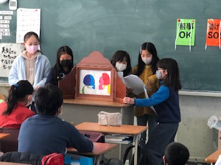 写真は、4年の地域防災グループが6年生のクラスで自作の紙芝居で発表しているようすです。このグループは、成城自治会の「災害対策プロジェクト」とコラボさせていただき、3.11の訓練に向けたポスターの制作をしたグループです。紙芝居では特に地震について発表をしていました。振り返りのクイズもありました。6年生は、とても良い聞き手です。温かい雰囲気で発表者を迎えてくれました。自治会の皆さんも教室の後ろで発表をご覧くださいました。