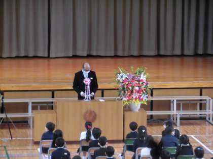 新2年生は出席できませんでしたが、録音した校歌と「さんぽ」で入学を祝い、新6年生の代表者からは明正小の魅力について教えてもらいました。