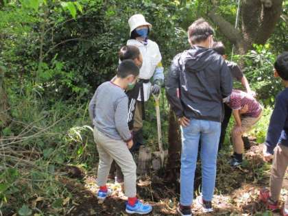 里山づくりメンバーの方々が、竹林の整備をされています。その様子を3年生が見せていただきました。タケノコの生える様子や抜き方を教えてもらい、教室にもどってタケノコをくわしく観察したり、カードにまとめたりしました。生活科や総合的な学習の時間等を通して、子どもたちも協力できたらいいですね。右の写真の大きなタケノコは、校長室の前にありますので、ぜひご覧ください。