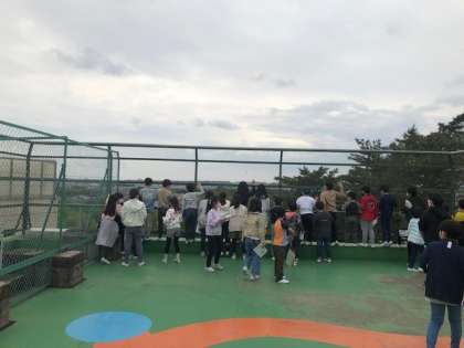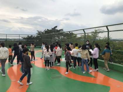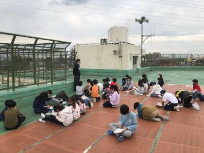 写真の様子は、屋上に出て、教室で予想した「東京都ってどんなところ?」について自分の目で確かめているところです。「でも、明正小の屋上から東京都の様子全てはわからない」「東京都の他のところの土地の使われ方も知りたい」と意見が出ました。東京都全体の様子について調べたい、知りたいという今後の学びへの意欲につながりました。