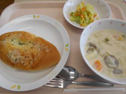 ガーリックフランス 米粉のクリームシチュー キャベツサラダ 牛乳