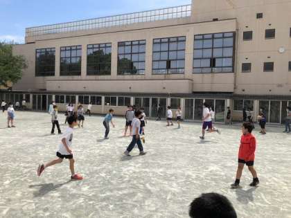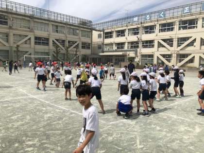 今日は昨日にも増して気温が上がりました。昼休みの時で校庭の気温は26度でした。校庭では、クラス遊びでドッジボールをしている子どもたちや担任と一緒に鬼遊びをしている子どもたちでにぎわっていました。けがの防止や手洗いについて指導していくと共に、十分な水分補給や息苦しい時には日かげに行ってマスクを外すことなど熱中症予防についても呼びかけていきます。