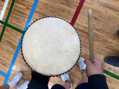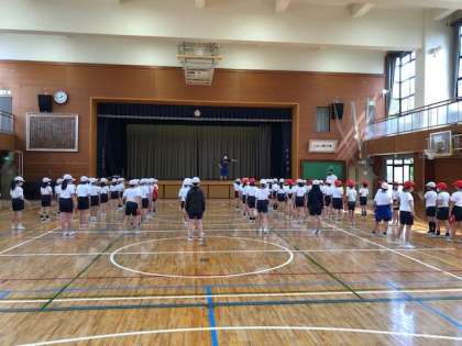 5時間目の体育館では、4年生2クラスが集まりました。運動会に向け、明正小伝統の「エイサー」練習が始まりました。まずは道具の説明や扱い方、練習に向かう心構えについて指導していました。
