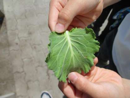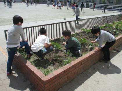 3年生が理科で「春の生き物」について学習しています。校庭の花壇のキャベツには、モンシロチョウが卵を産んでいるようです。とても小さな3mmくらいの幼虫を見せてくれました。無事に成虫になるとうれしいですね。