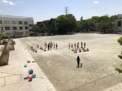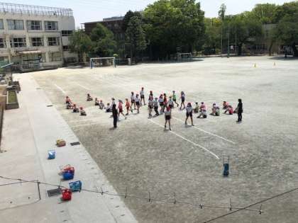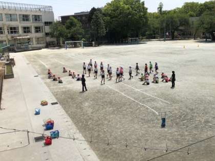 校庭から一定のリズムで鳴る電子音が聞こえてきました。様子を見てみると6年生が運動会で行う表現運動の練習をしていました。子どもたちは隊列を組み、電子音に会わせて行進をしていました。隊列を崩さないことも簡単にはいきません。それに加え、横から来る別の隊列グループとぶつかることなく交差しなければならないようです。そこに加わる子どもたち全員のリズムや歩幅がそろわなければできません。心を合わせ団結する!6年生の今年の運動会の最大のテーマとなりそうです。