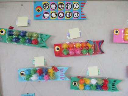 ひまわり学級の廊下には、こいのぼりが気持ちよさそうに泳いでいます。卵のパックやお花紙を使って作りました。同じこいのぼりはなく、それぞれすてきなこいのぼりです。こいのぼりは、江戸時代からあげられているそうです。