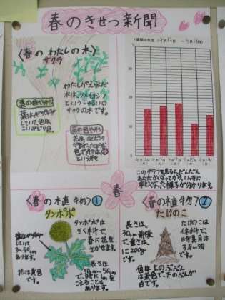4年生は、理科で学習した春の生き物や植物を新聞にまとめました。里山や校庭で観察したり、インターネットや本で調べたりしました。新聞には、1週間の気温の変化も載せています。春以外の季節ではどのように変わるのか、これからも調べてみたいですね。(また、世田谷区以外の地域とは、どう違うのでしょう?)