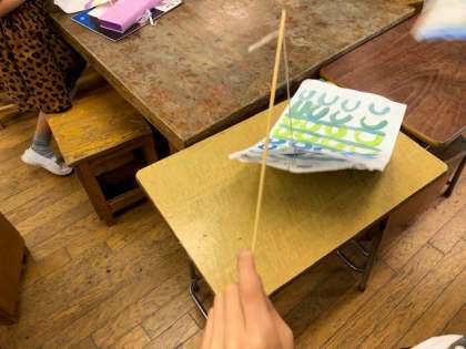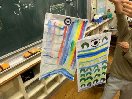 「太っちょ魚つり こいのぼり」と題した授業で、和紙に思い思いの模様を描いてこいのぼりを作りました。ただこいのぼりを作るだけでなく、針金で作った輪っかと釣り針で「魚つり」で遊ぶこともできます。どの作品も春らしく、伸び伸びと元気な鯉のぼりとなりました。