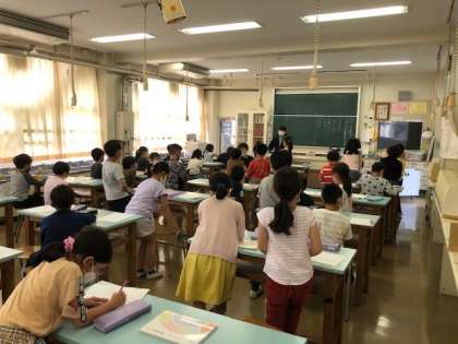 3年生の日本語の授業の様子です。今日は「同じ音で、ちがう意味の言葉を見つけよう」という内容でした。写真は発表場面です。たくさんの子が発表がしたくてたまらない様子でした。このような言葉遊びを通して、子どもたちは語彙を広げ、日本語の楽しさを感じていくのだと思います。