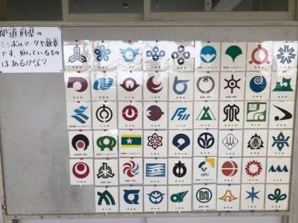 高学年算数教室の廊下には、様々な模様のマークがたくさん掲示してあります。左の写真は都道府県のマークで右の写真は家紋です。身の回りにはこのように目を引く模様が数多くあるのですね。これらの掲示物は6年生の「対称」の学習に関連した掲示物です。学習したことを基に身の回りの図形に着目し、対称な図形の美しさや楽しさを味わわせていけるよう工夫しています。
