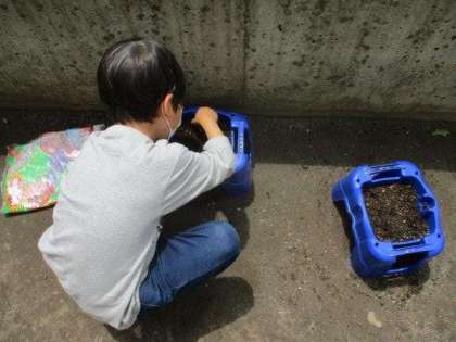 1年生がアサガオの種をまいています。植木鉢に土を入れ、指で穴を開け、種を入れて、優しく土をかけてあげました。種は、まく前に色や大きさ、形などをじっくり観察しました。小さな種からどのように育つのでしょう。何色の花が咲くかな? 楽しみです。