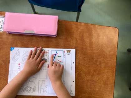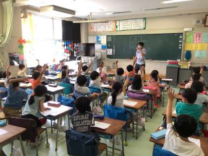 連休明けから1年生も5時間授業が始まりました。今日はその2回目です。月曜日ということもあり、疲れているのではと教室をのぞいてみると、子どもたちは元気いっぱいにひらがなの学習をしていました。今日は「た」の学習です。「た」のつく言葉を紹介し合ったり、まちがいやすいポイントを確認したりした後、指で「た」の文字をなぞり書きしました。字形を大まかにとらえてから、鉛筆を使って書き始めています。みんな意欲的に取り組んでいました。