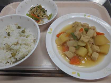 グリンピースご飯 新じゃがのそぼろ煮 野菜のごま和え 牛乳