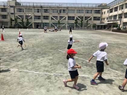 1年3組の体育の様子です。ホワイトボードを使って、この時間にやることがわかるように子どもたちに示しています。直線や曲線、ジグザグのコース、ミニハードルを越えるコースなど走る場所がたくさん用意されていました。いろいろなコースを走ることを経験しながら、「気持ちよく走るためのポイントを知る」ことがこの時間のめあてでした。特に、曲線のコースやジグザグのコースは走りづらそうでした。このコースを気持ちよく走るにはどんなポイントがあったのでしょう。ぜひご家庭でも話題にしてみてください。