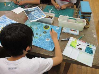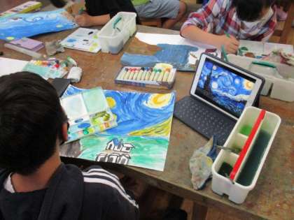 6年生は、図工で「名画のその先」を描いています。名画をよく見て、その先の様子を想像します。同じ名画から、生まれるその先の絵は、子どもたちの人数と同じだけあります。できあがった絵は、他の子と鑑賞し合います。鑑賞することで、気付かなかった新しいアイディアに気付くことができるかもしれませんね。