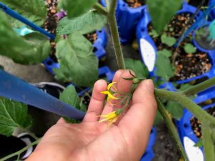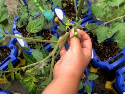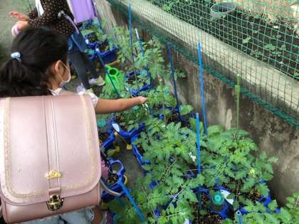 2年生が登校してまず向かうのは、野菜を育てている鉢のところです。野菜の生長、変化を確かめに行っています。「花が咲いてる」「昨日よりも少し実が大きくなったみたい」と様々な変化に気づいています。これからも愛情たっぷりに野菜とかかわり続けてほしいと思います。