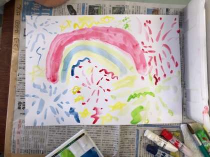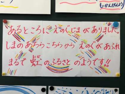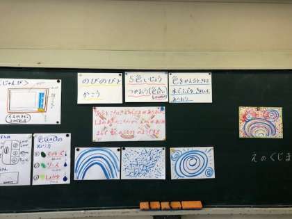 2年3組の図工では「えのぐじま」という題材名で、絵の具を使った絵を描きました。真ん中の写真のように題材をストーリー仕立てで子どもたちに紹介し、子どもたちがイメージをもちやすいように、またいろんな発想を引き出すように工夫していました。絵の具を混ぜたり、水の量を調整したりと絵の具の特徴も学ぶことができました。みんなのびのびとイメージしたことを表現していました。