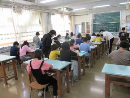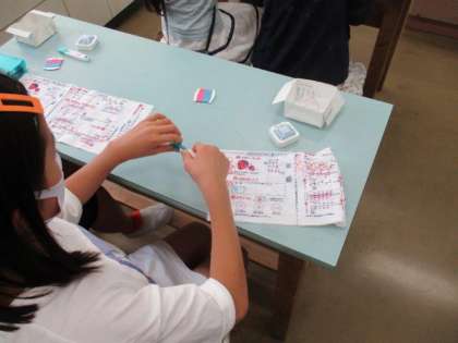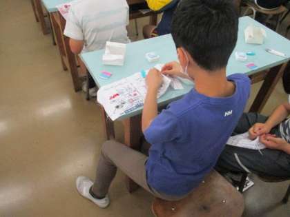 5年生の家庭科では、手縫い練習の布が終盤になってきました。「かがり縫い」「半返し縫い」などに取り組んでいます。名前やマークを刺繍している子もいました。