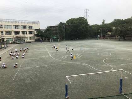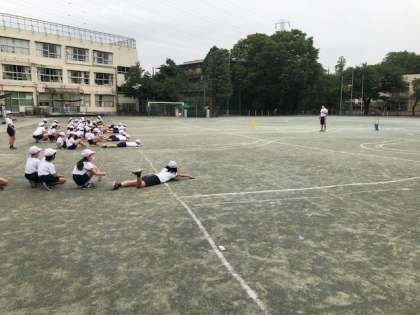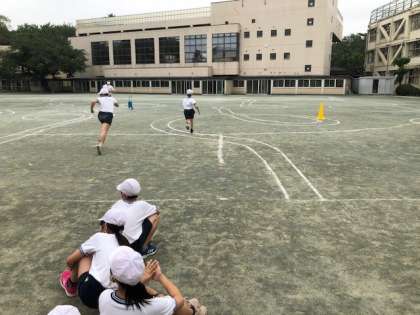 校庭をのぞくと、くねくね曲がった線がたくさん引かれていました。5年生体育「短距離走」の運動の場です。それらのラインを見ただけで「走ってみたい」と思えてきます。このようなコースに沿ってトップスピードで走ったり、ケンケンで走ったりすることを通して、曲線で内側に体を傾けることを感覚的に学び、地面を力強く蹴る力を身に付けていきます。また、電子ホイッスルの音に素早く反応し10m程度をトップスピードで走り抜ける運動も行いました。うつぶせの姿勢から、あおむけの姿勢からなど様々に姿勢を変えて行い、ゲーム性をもたせながら、音に素早く反応して走る体勢を整える俊敏性をはぐくむ指導が行われていました。