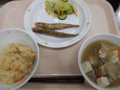 山菜おこわ ししゃものからあげ そくせきづけ けんちんじる 牛乳