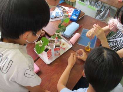 5年生は、理科で発芽について調べています。発芽する時の栄養は、どこにあったのか、ヨウ素液を使って調べています。ヨウ素液は、「○○○○」に反応すると赤紫色に変化します。6年生では、だ液のはたらきを調べる時にもヨウ素液を使いますね。