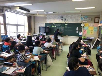 写真のインゲン豆の育ち方にはだいぶ違いがあります。日光を当てたものと箱をかぶせて日光を遮ったものの育ち方の違いです。このようにして、日光・肥料・土のあるなしで、どのような成長の違いあるかを確かめ、種子の発芽と成長に必要な条件をまとめました。「考察」の時間には、結果から考えたことに加え、総合的な学習の時間でこれから取り組んでいく夏野菜の栽培に活かせることを自分の言葉でまとめました。このように理科と総合を関連させて学習を進めることで、理科での学びがより深いものになっていきます。このような知識の習得から探究・活用していく学ぶ過程を通して、子どもたちが主体的に学べる授業づくりに努力しています。
