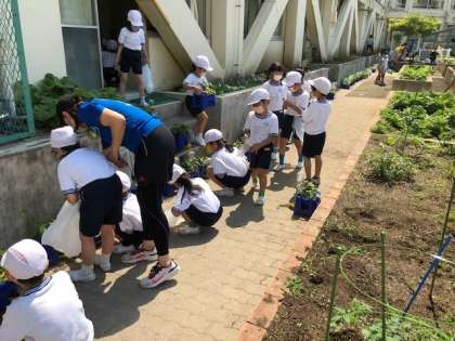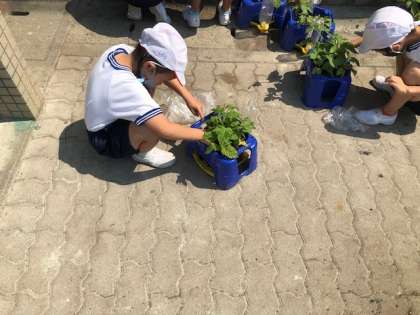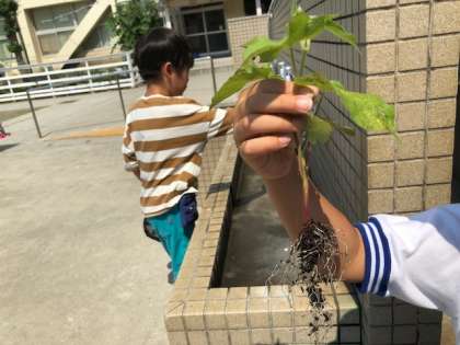 教室前で育てているアサガオがだいぶ育ってきました。より栄養を届きやすくし、強く、大きく育てるために間引きをしました。根に近い方を持ち、揺らしながらゆっくりと引き抜きました。上手に間引くことができました。鉢に残した他のアサガオは、これからさらに生長していくことでしょう。