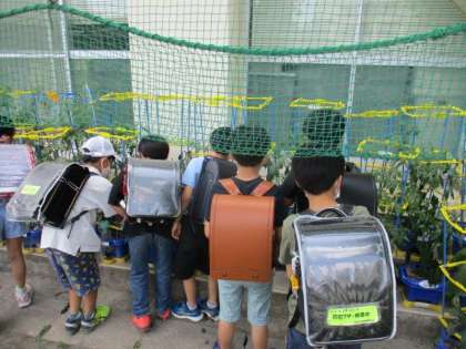 2年生が大切に育てている夏野菜が、ぐんぐん大きくなっています。下校の前に忘れずに水をあげています。