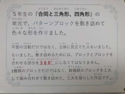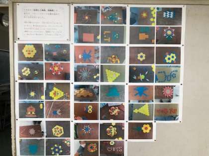 算数の学習が進み、掲示物をリニューアルしました。5年生の「合同と三角形、四角形」で学習したことを生かして、パターンブロックを敷き詰めて様々な形を作りました。とてもきれいな模様が並びました。規則性を見つけて作り上げた形や、敷き詰めるうちに偶然出来上がった形など完成にたどり着くまでの過程も様々です。図形学習の楽しさを味わいました。