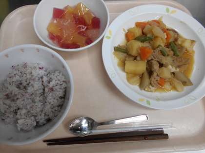 ゆかりごはん 五目うま煮 あじさいゼリー 牛乳