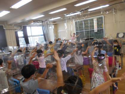 1年生は週に一度、低音楽室で音楽の学習を行っています。今日は、歌を体で表現しました。初めてやってみるふり付けにとまどいながらも楽しく活動しました。また、動きをつけることで曲の楽しい雰囲気を味わうことができました。