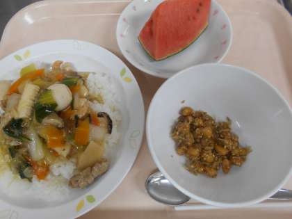 中華丼 大豆とじゃこの甘から揚げ 小玉すいか 牛乳