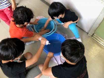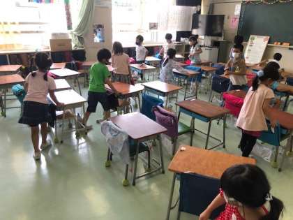 1年生は今はもう6年生のちからは借りずに、自分たちの力で掃除をしています。机を運ぶ時には友達に声をかけて協力しながら運んでいました。時間内に終わらせることはまだ難しいようですが、安全に気をつけ、約束を守りながら取り組めるようになりました。大きな成長です。
