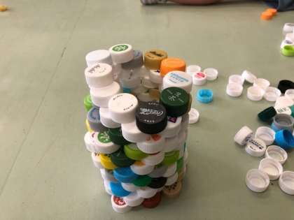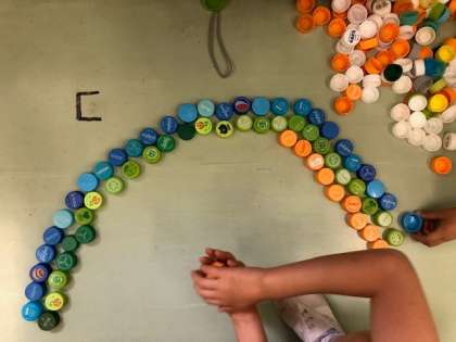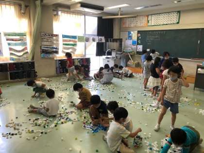 1年3組では図工の時間を公開しました。「いろいろならべて」という題材で、ペットボトルキャップを大量に用意し、キャップを思い思いにならべていく造形遊びでした。色にこだわって集めてきれいに並べる子、立体的に積み上げていく子など様々でした。始めに床に広げられたペットボトルキャップを見て大興奮だった子どもたちが、徐々に無言になりキャップ並べに没頭していく様子が微笑ましく映りました。道具、環境の設定が子供たちを引きつけていました。
