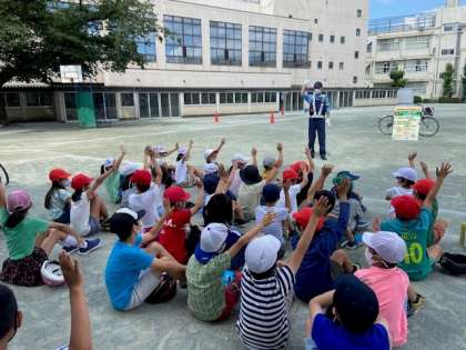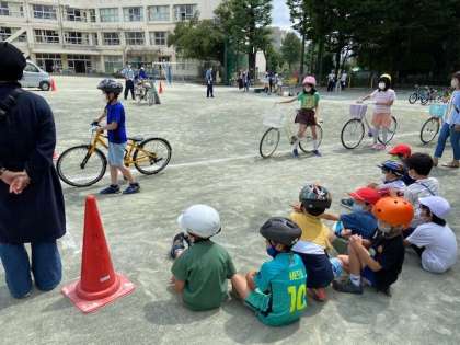 警察の方に来ていただき、自転車の安全な乗り方について教えたいただきました。右左確認に加え、右後ろの確認も大切なことを知り、「今日からやってみよう。」や「標識に注意して運転しよう。」と話している子も多くみられました。学んだことを早速生かそうとしていました。これを機に、自転車の点検・乗り方の確認をしてみてください。