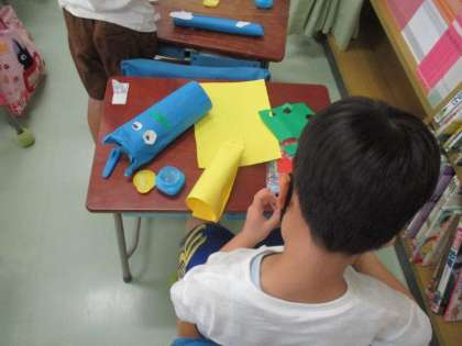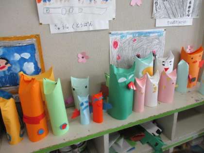 1年生は、図工で、紙を丸めて、へこませた形から発想して作っていました。「うさぎ」「ねこ」「ふくろう」「おばけ?」…といろいろな形ができていました。友達とできあがった作品を見合うことも楽しいようです。