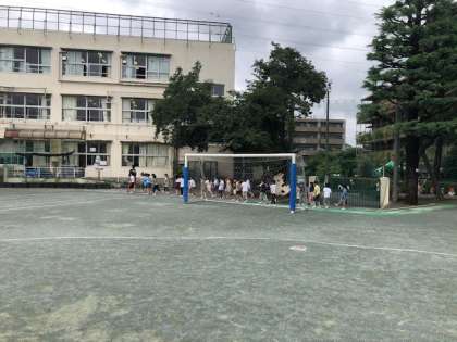1年生が絵本室から教室に戻る様子です。BOP棟の2階にある絵本室までは、雨が降っていなければ北昇降口からグリーンベルトを通って行っています。しっかり並んで移動できています。