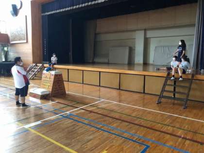 誰もいない静かな体育館では、暗幕を閉め、スポットライトをつけて集会委員会が撮影を行っていました。7月の児童集会でのクイズのための撮影でした。内容はまだ秘密です。毎回、全校児童を楽しませてくれる集会委員会です。次回も大いに期待できそうです